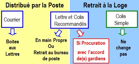 Mesdames, Messieurs, les résidents, depuis la reprise de la distribution par la Poste, vous êtes nombreux à nous interroger et/ou à solliciter les Gardiens et le Régisseur sur ce sujet. Veuillez trouver ci-dessous les modalités de distribution du courrier, colis et recommandés.